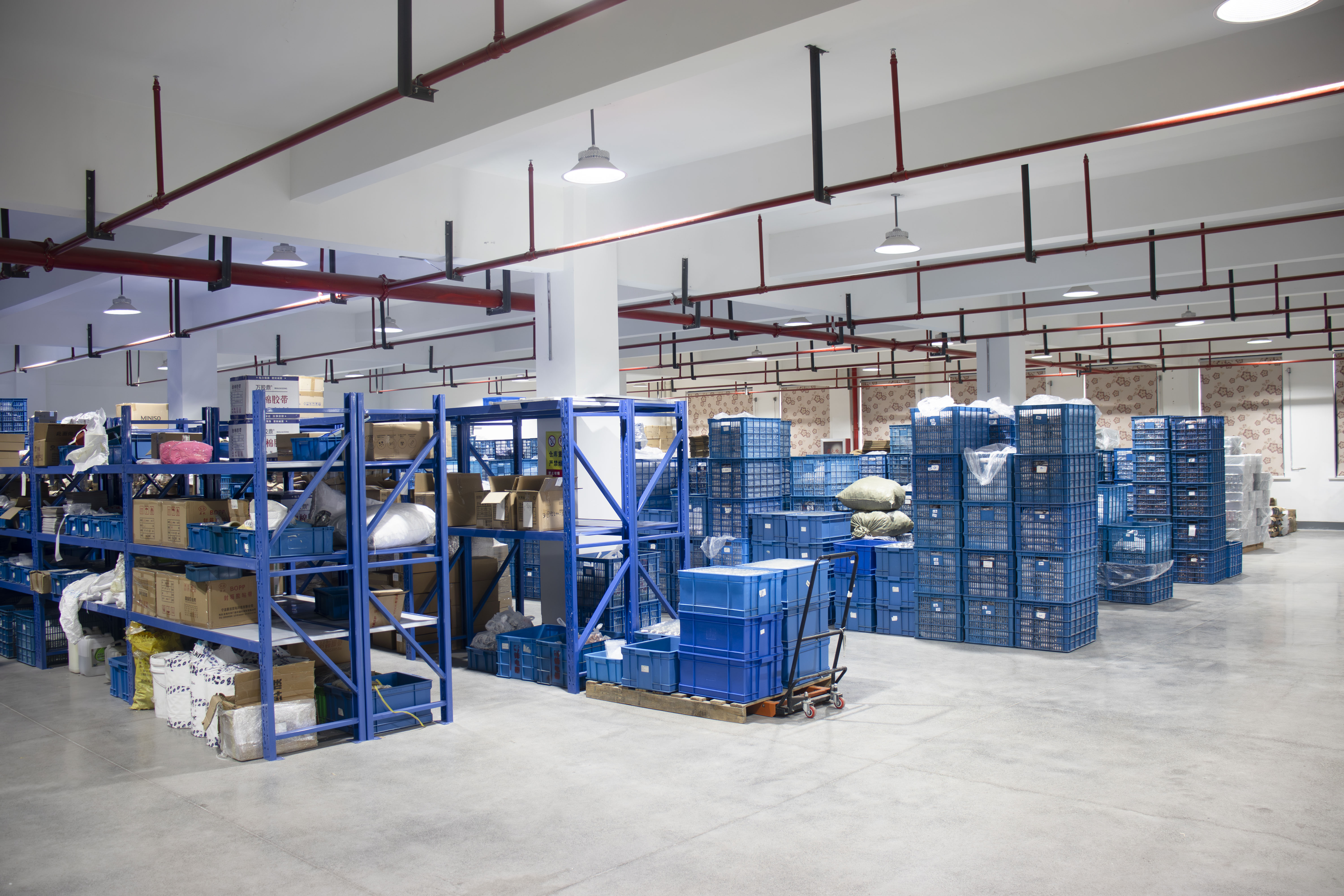 Verkstedet har lyseblå epoksygulv med gule avgrensningslinjer, som tydelig definerer arbeidsområder og materialkanaler. Komponenter er kategorisert i blå lagringsapper, mens monteringsarbeidsstasjoner er utstyrt med skyggeløse belysning og industrielle ventilasjonssystemer. Bakre flerlags hyller lagrer produksjonsmateriell, synkronisert med kontrollterminaler for å overvåke bruk av sanntid og minimere driftsstans.